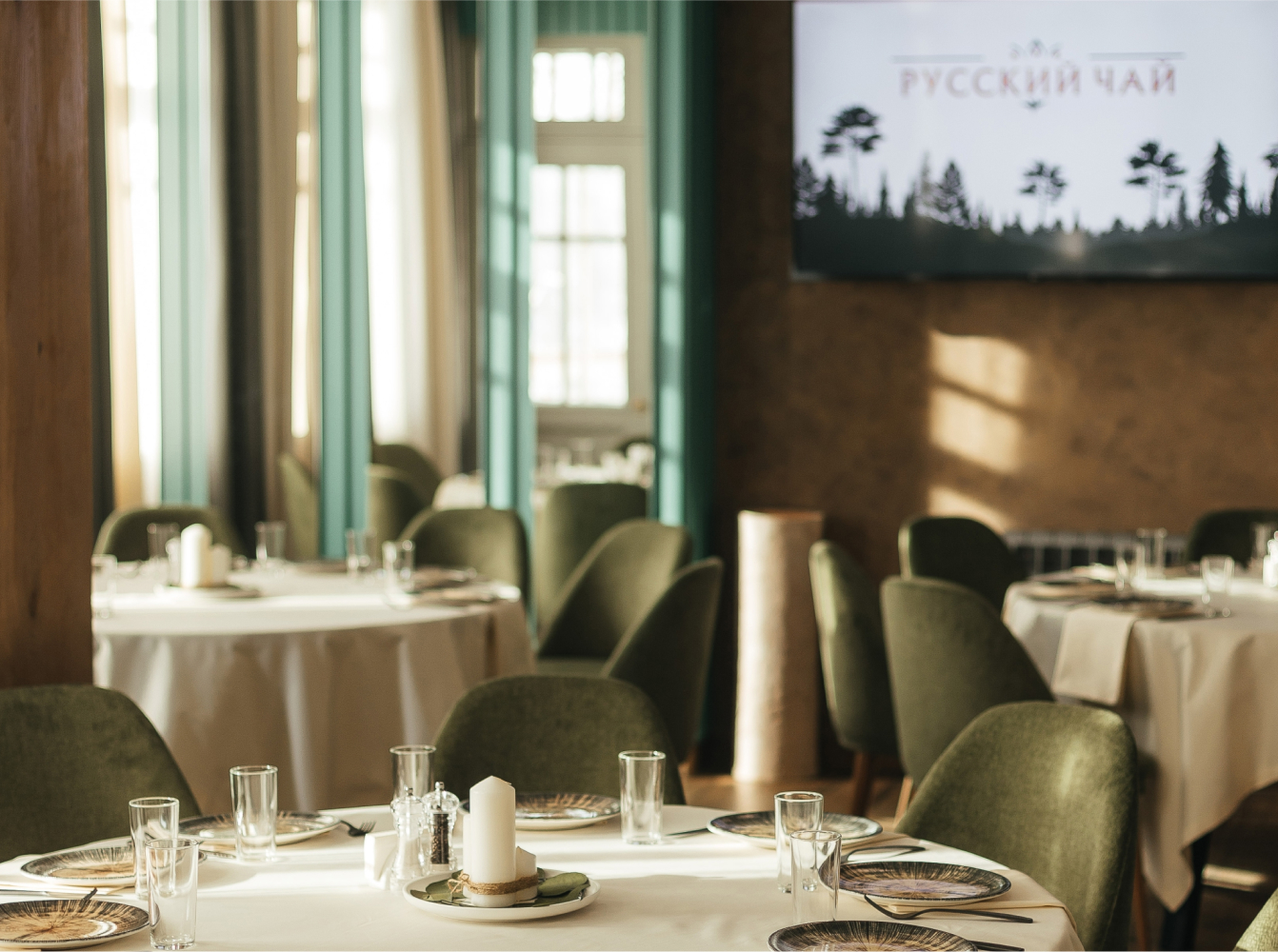 Ресторан «Русский Чай» — это эстетика Сибирского солнечного леса в архитектуре, интегрированная в современную урбанистическую жизнь города, в сочетании русского вкуса Сибири.